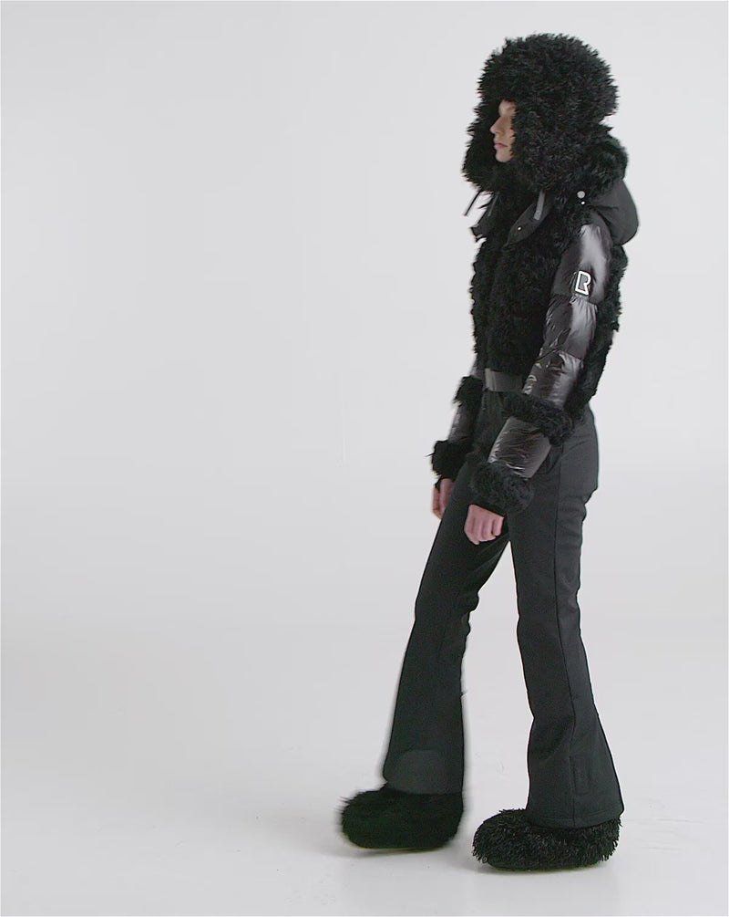 Make a statement on the slopes in the DONATELLA by RUDSAK, a women's sleek, fitted one-piece ski suit designed to turn heads. Featuring a technical stretch exterior with luxe shearling details, quilted glossy arms and back, and vegan leather trims, this statement piece exudes sophistication. A removable waist belt adds definition, while back zippers on the legs and reinforced inner kick panels ensure practicality. Hip pockets and a hood enhance its functionality, and RECCO rescue technology offers added safety. The DONATELLA is a sexy, high-performance ski suit that combines bold style with technical excellence.